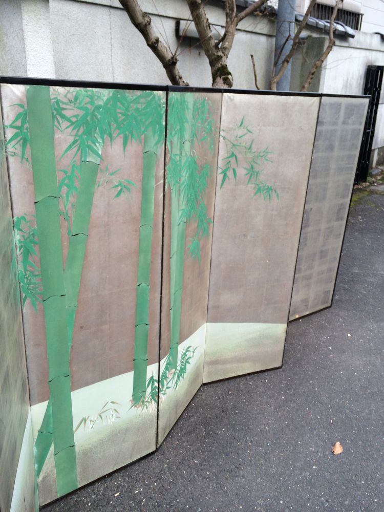 Silver screen w/ orange bamboo. Early Showa, ( About 1950s) The screen is in very good condition. Collected at auction in Shiga, Japan