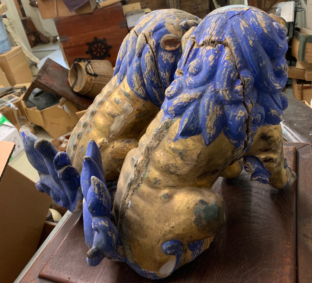 Edo period,(1615-1868) Japanese wooden Shishi,(Temple guardians), with hand blown glass eyes.