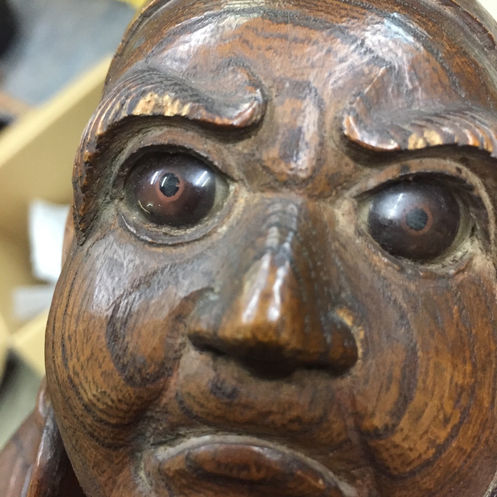 Taisho period keyaki,(Zelkova wood) Daruma with hand blown glass eyes. Stands 16" high with Incredible presence.
