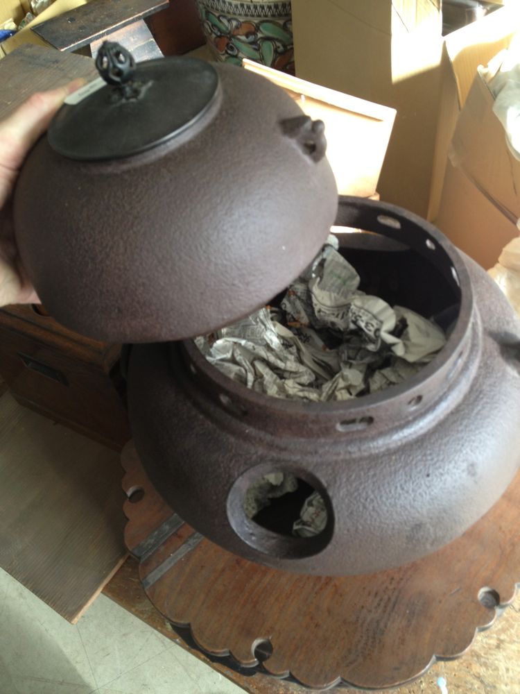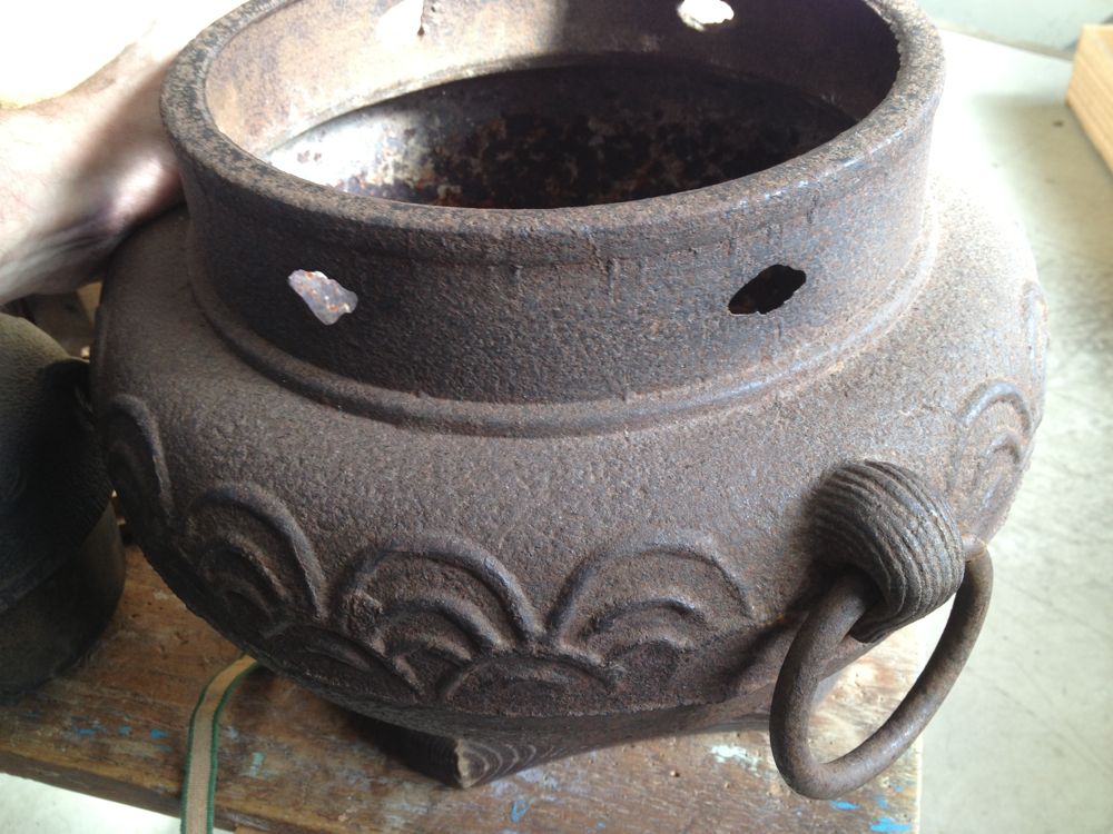 chagama, 19th century Iron Tea pot in hibachi( 1) Chagama bottom pc,with design( 2) $375 ea