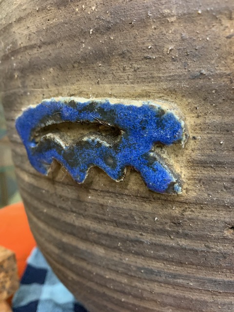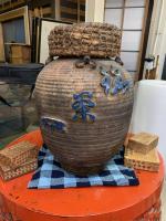 Antique,(Edo period 1615-1968), Japanese cha tsubo,(Tea storage pot) with raised characters. Collected in Fukui prefecture. Mei tea Company.