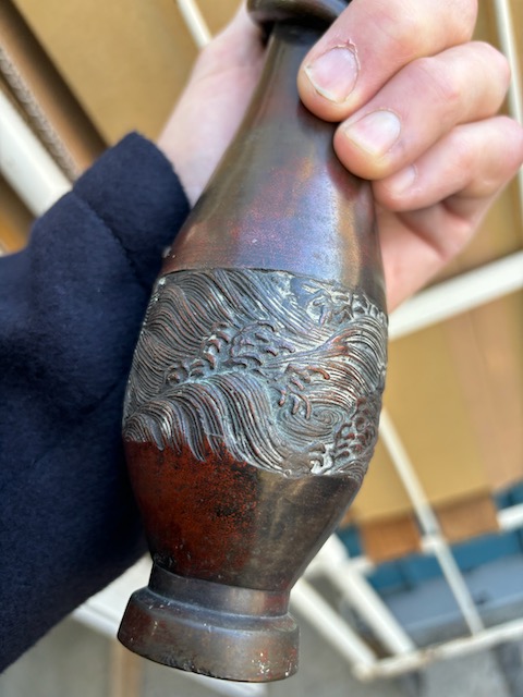 A bronze Taisho period,(1912-1926) hanaike,(Flower display vase) with a wave design at the base and dragon wrapped around its elongated goos neck. Spectacular workmanship and patina.