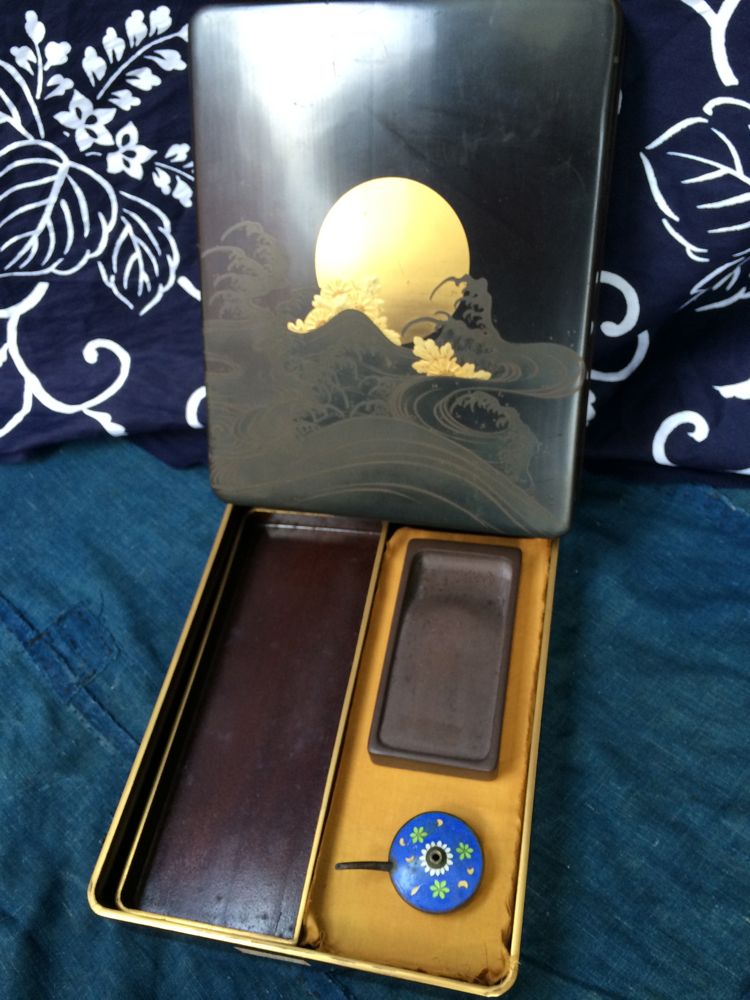 Japanese Meiji/taisho Suzuri bako Lacquered ink Box with beautiful Cloisonné Suiteki,( Water dropper) W. 7 3/4" D. 9 1/2"