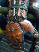 All hand made red lacquered metal and embroidered silk, come with wooden blade sword and black and gold lacquered fan.